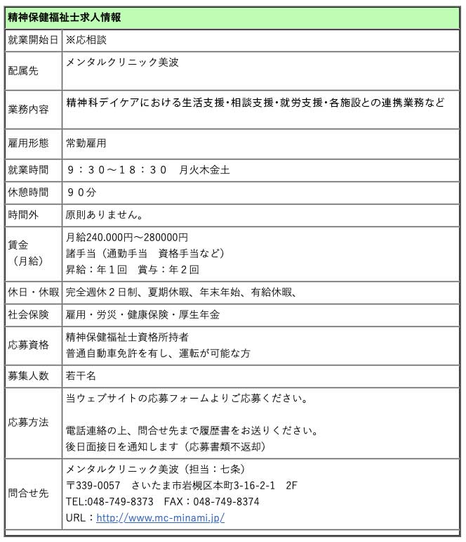 【採用情報】当院では精神保健福祉士の職種で常勤できる方を募集しております。